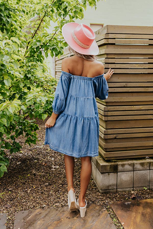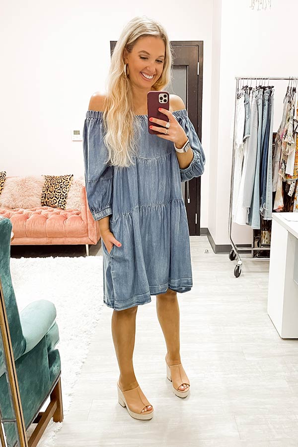 You will look like you belong front row at a fashion show when you arrive in this charming dress featuring lightweight medium wash chambray material, an straight elastic off shoulder neckline with oversized puff drop sleeves, hidden side pockets, and a relaxed tiered silhouette that falls into a straight mid-thigh length hemline! Measurements