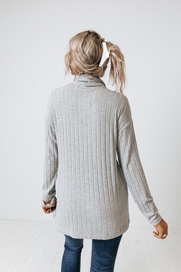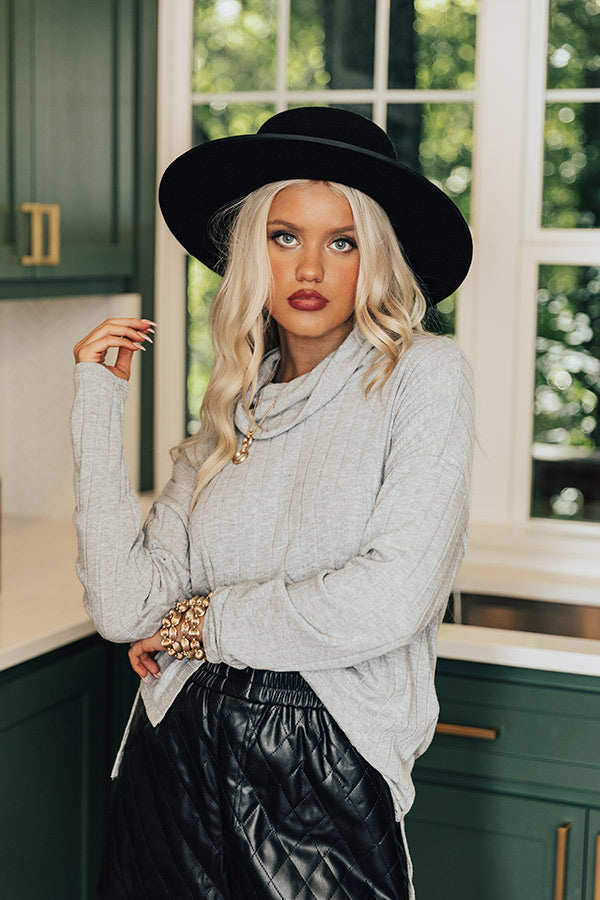 Take your fall basics to the next level with our simple but stylish grey 'Full Moon Shift Top' featuring soft lightweight material with wide ribbed detailing, a bunched turtleneck, long loose sleeves, and a flattering silhouette that ends in a straight hemline with accent side slits!