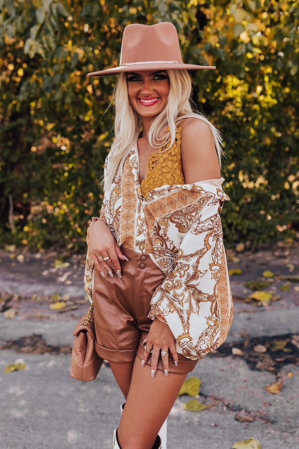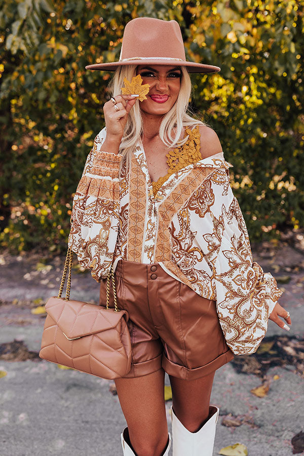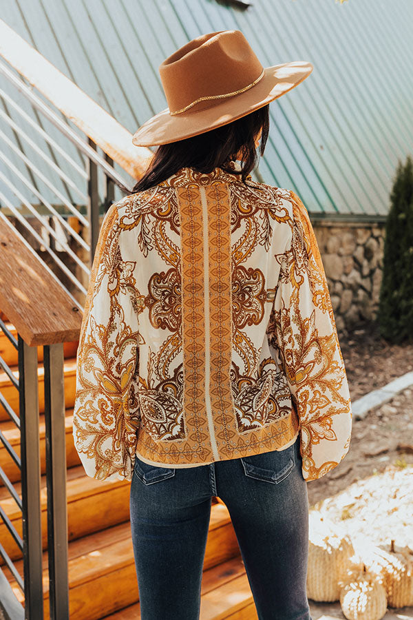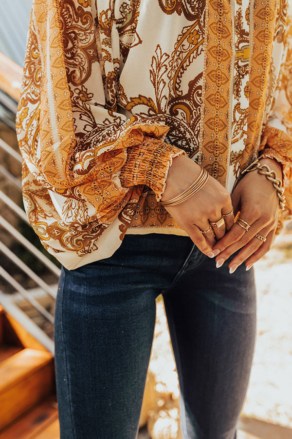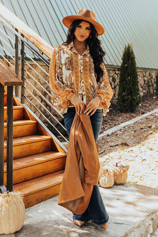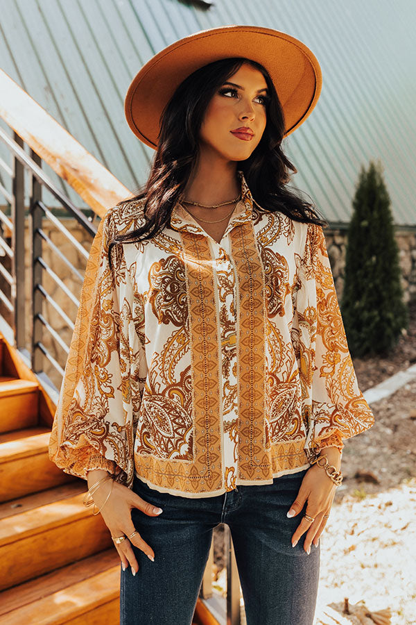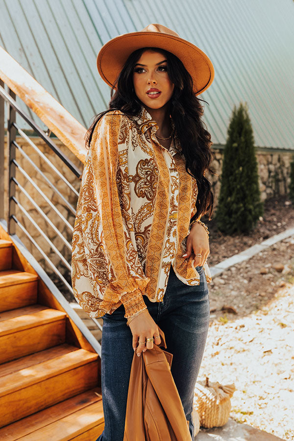 You're ready to go boho in our 'Full Of Hearts' shift top! Features lightweight cream, yellow, peach, brown, and sage hued bohemian print chiffon fabric, collared neckline that goes into a button down front, long balloon sleeves with smocked cuffs, and a relaxed silhouette that falls to a straight hemline.