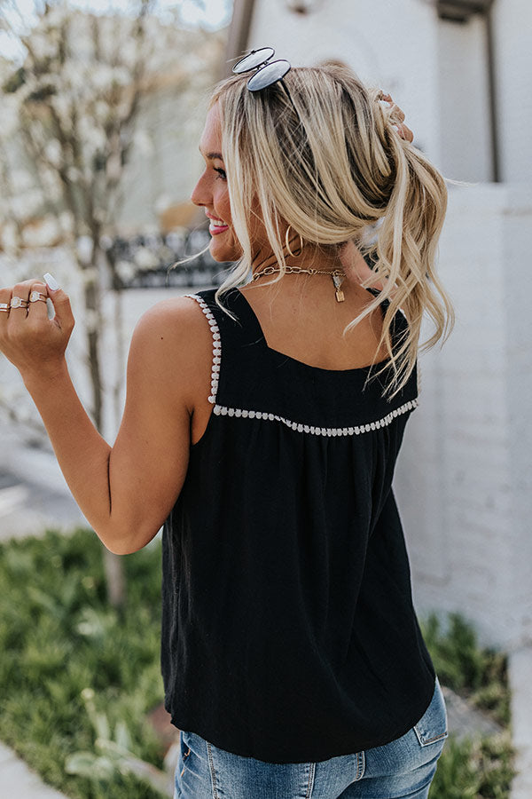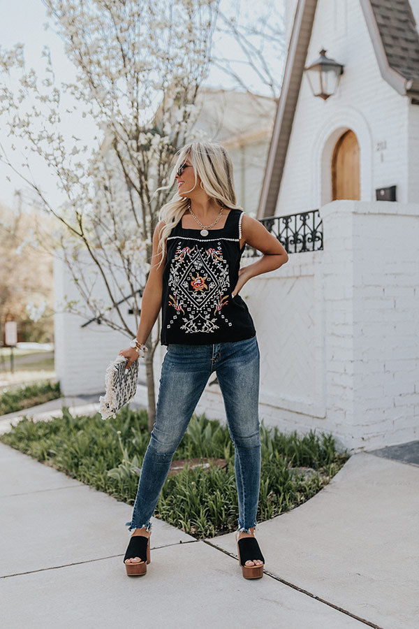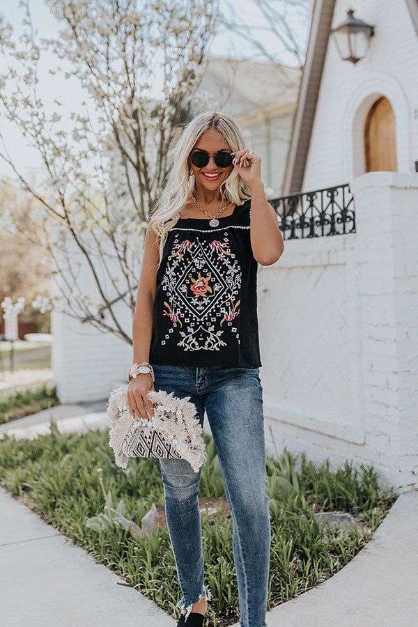 Your outfit will be full of promise when you complete your look with this fun black tank featuring lightweight material with intricate embroidered detailing down the front, a square neckline and upper back, wide sleeveless shoulder straps, and a flattering silhouette that ends in a straight hemline! Measurements
