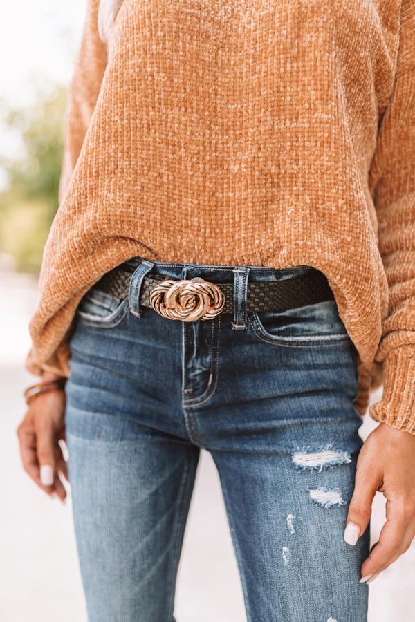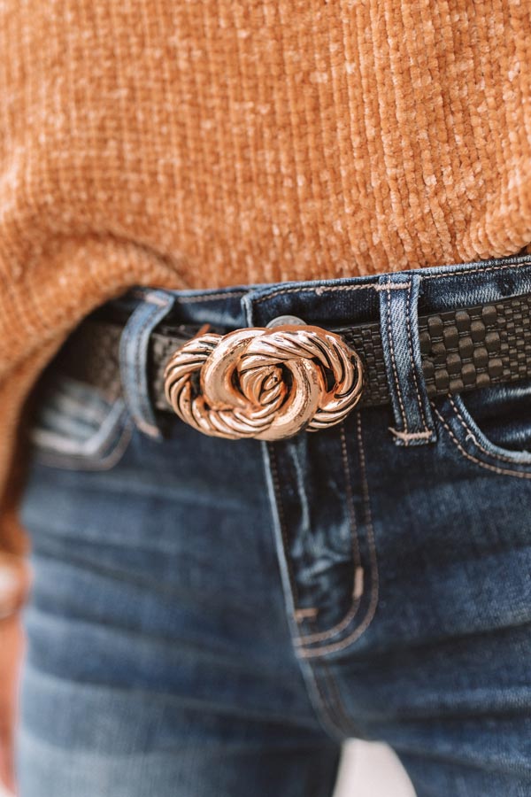 You will undoubtedly be a "full on fashionista" when you wear this black belt featuring a uniquely textured strap and an intricate gold looped buckle!