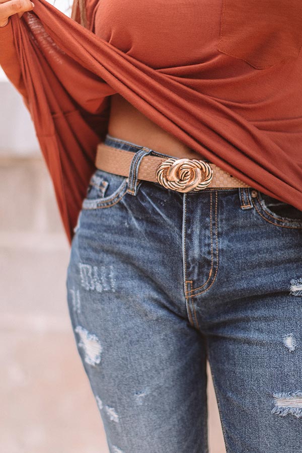 You will undoubtedly be a "full on fashionista" when you wear this brown belt featuring a uniquely textured strap and an intricate gold looped buckle!