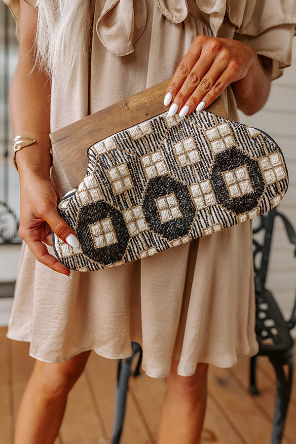 Add a fun detail to your look with this stunning clutch featuring black, gold, and white beaded detailing, a wooden closure, and a slouched fully lined silhouette with an additional inside pocket!