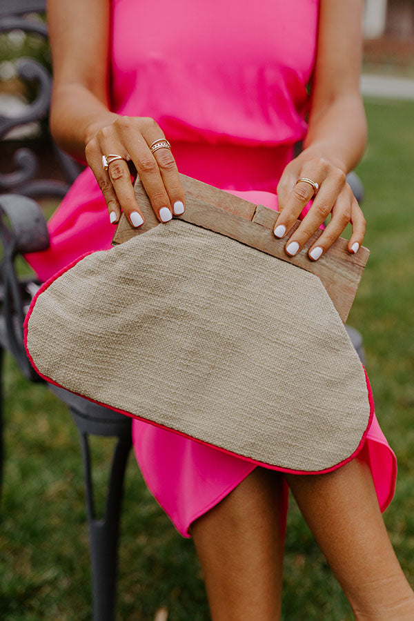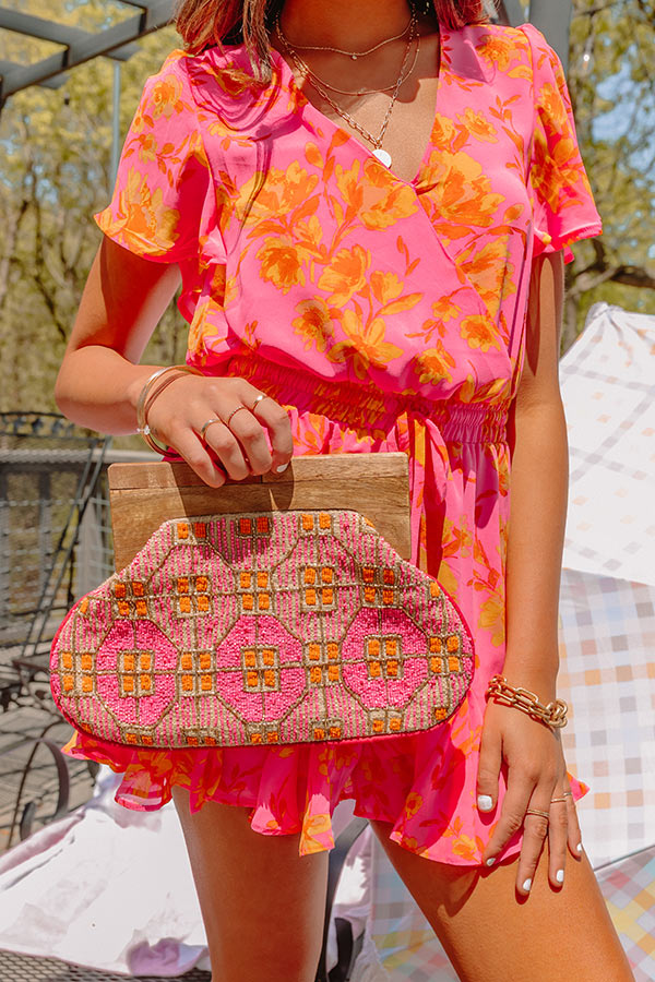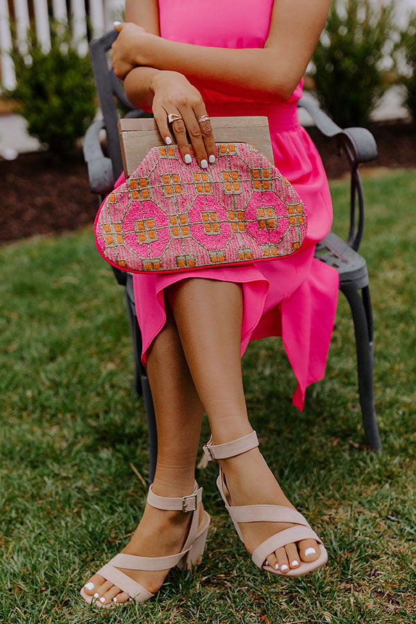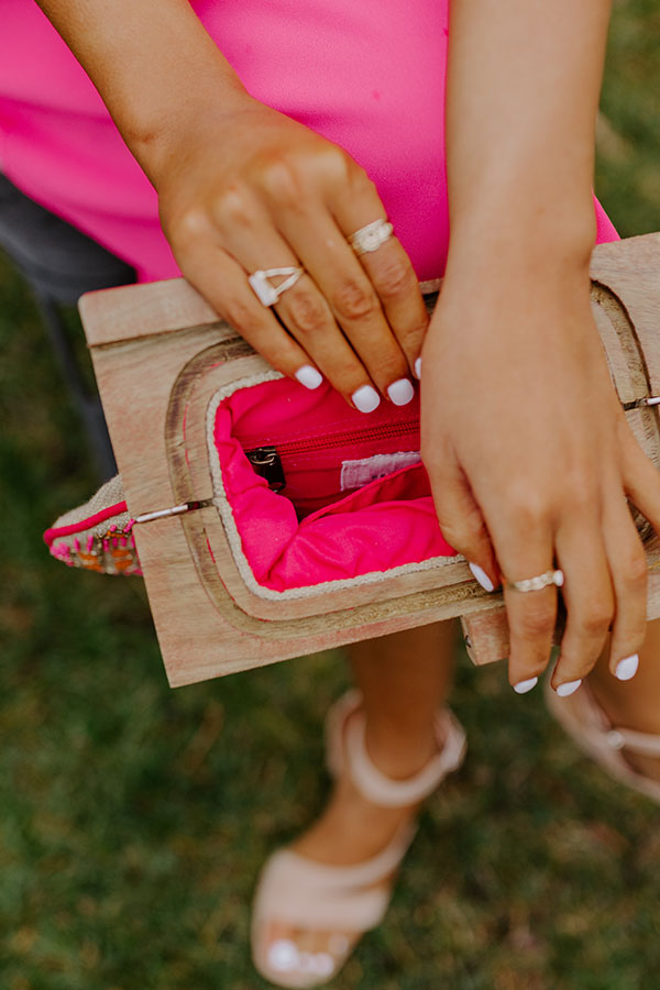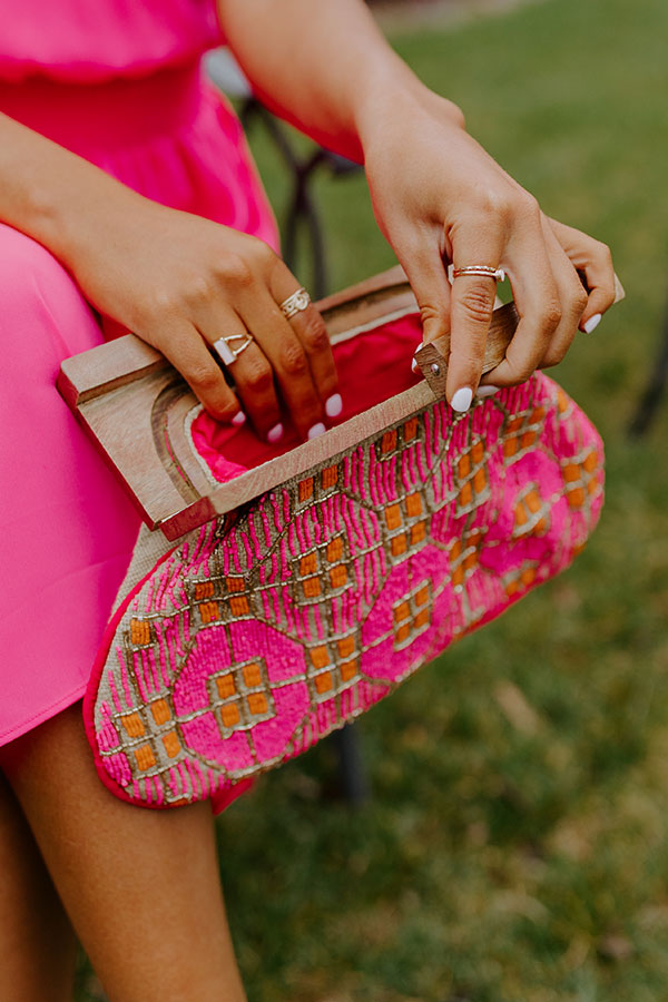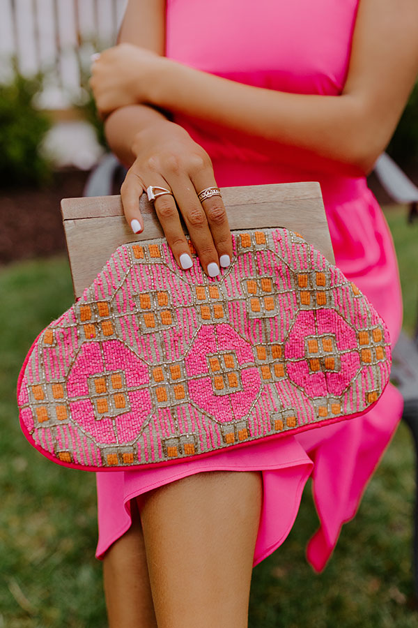 Add a fun detail to your look with this stunning clutch featuring hot pink, gold, and orange beaded detailing, a wooden closure, and a slouched fully lined silhouette with an additional inside pocket!