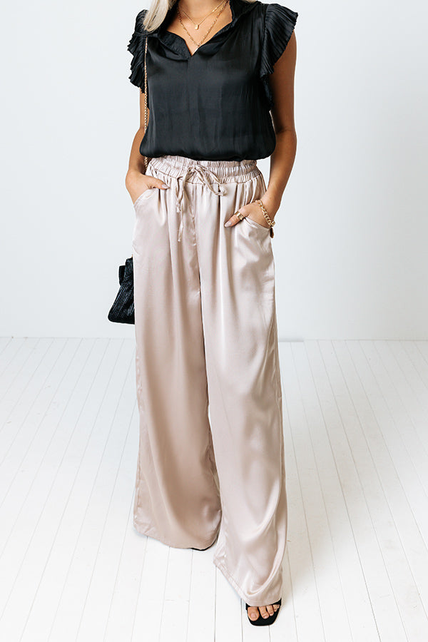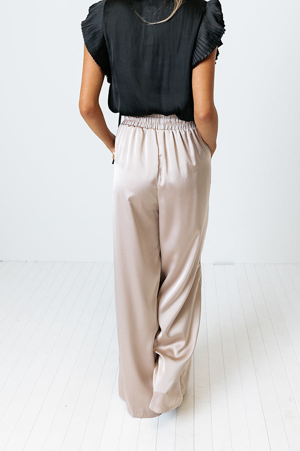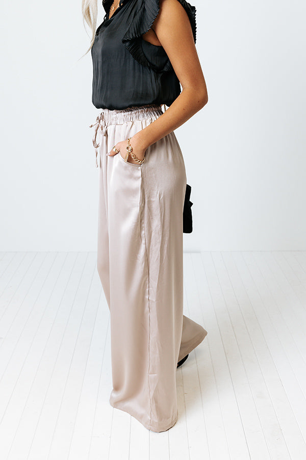 You will look like a total girl boss in our pretty iced latte colored 'Future In Focus' pants featuring sleek lightweight and breezy satin material, an elastic waistline with a tie closure, accent side pockets, and a relaxed silhouette that falls straight into floor-length hemlines! Measurements