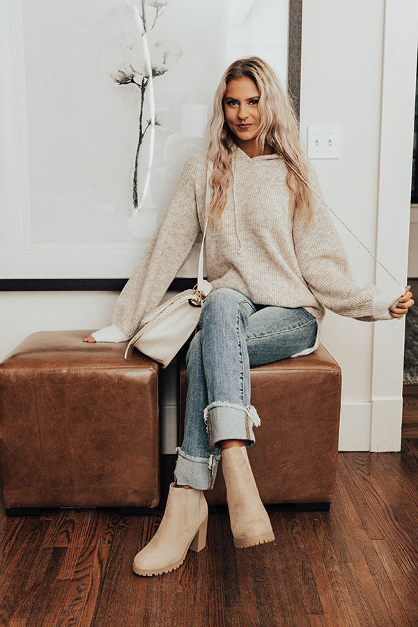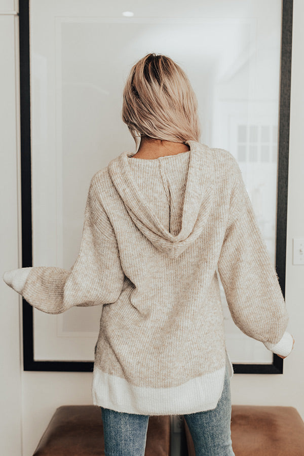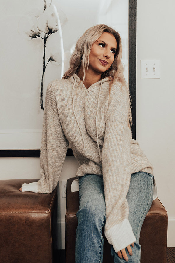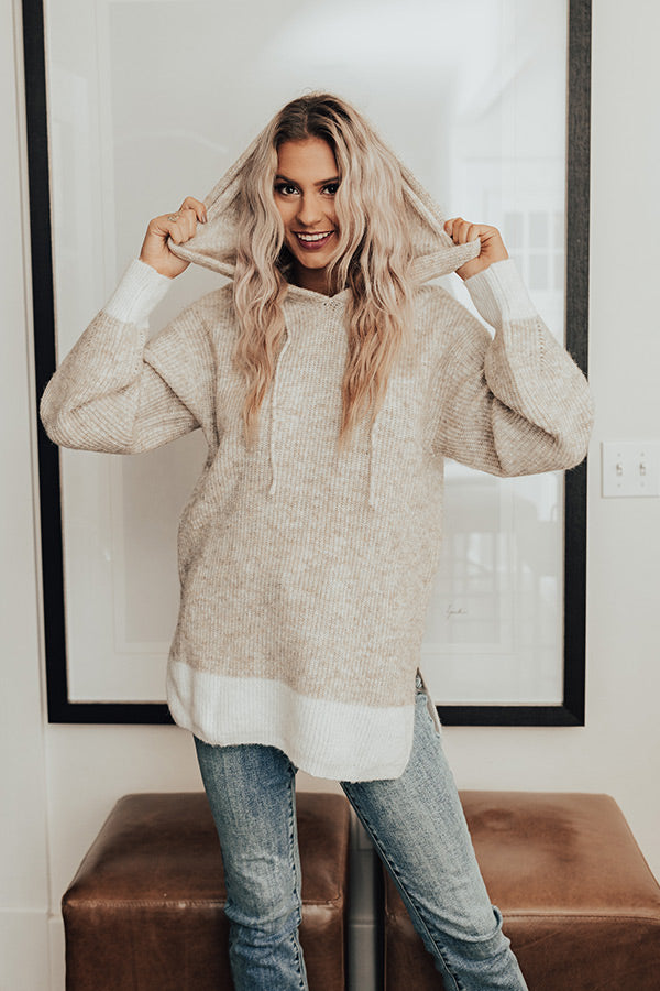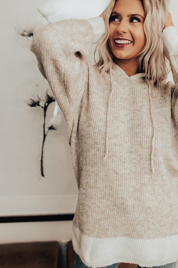 Keep it casual in our light birch hued 'Fuzzy Memories' sweater featuring soft knit material with thick white trim detailing, a rounded neckline with a drawstring hooded back, long loose sleeves, and a relaxed silhouette that falls into a straight hemline with accent side slits! Measurements