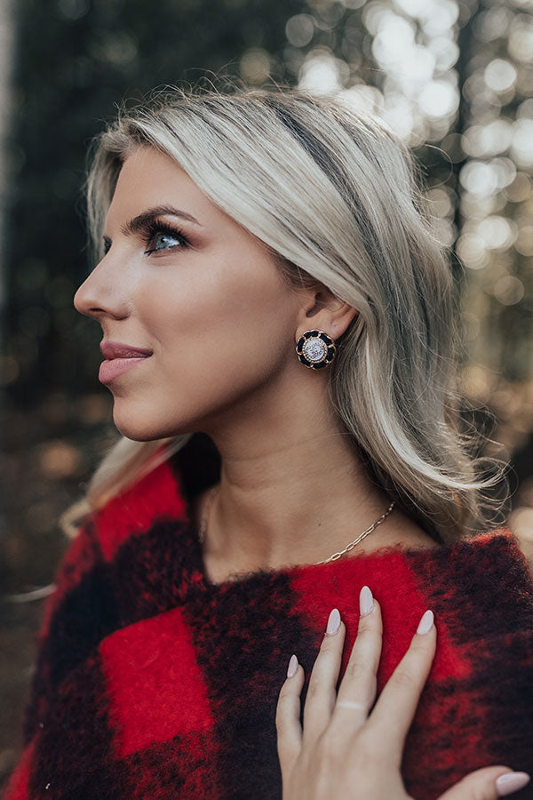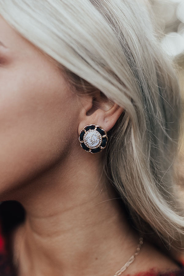 Accessorize luxuriously with our designer inspired 'Gala So Grand' earrings featuring a white center stud surrounded by a black ribbon gold chain!