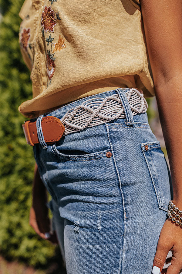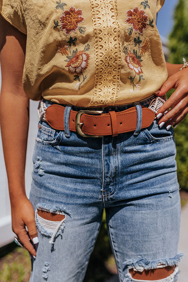 There is no better way to complete your summer look than with our fashionable 'Galapagos' belt featuring a woven strap with a brown faux leather front!