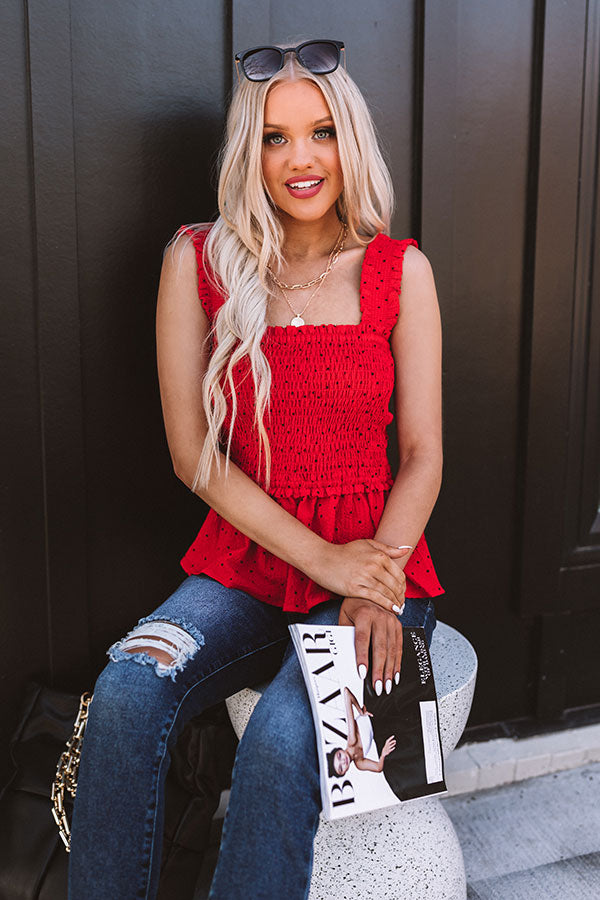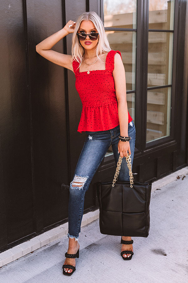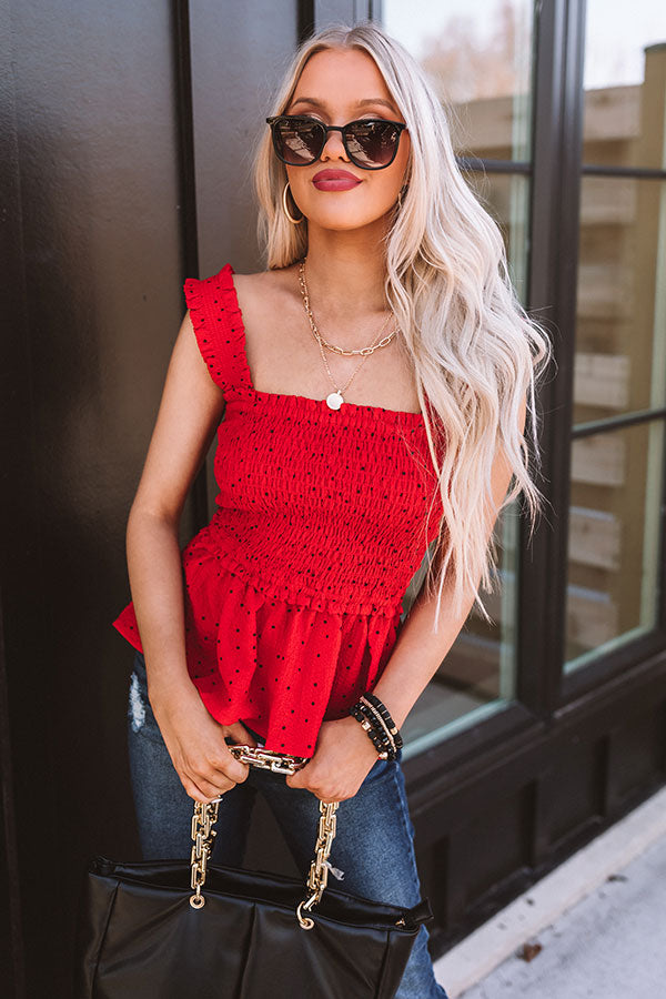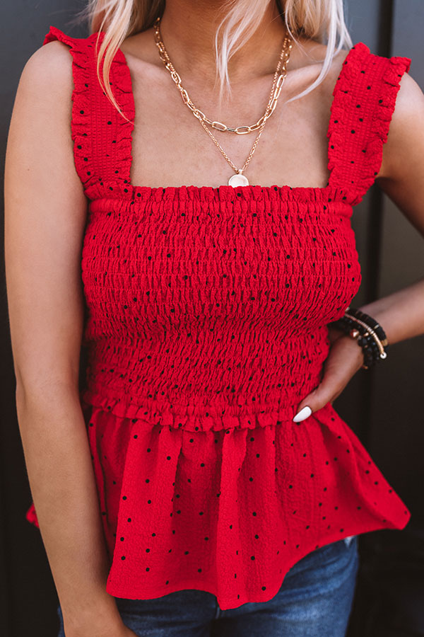 When in doubt...wear red! Our flirty 'Gamble On Me' tank features lightweight material patterned with subtle black polka dots, a flattering smocked bodice, a square neckline and upper back, wide sleeveless shoulder straps with ruffled trim detailing, and a fitted silhouette that falls into a peplum bottom with an uneven hemline! Measurements