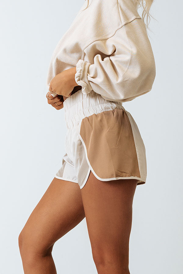 Put your best game face on in these adorable beige colored active shorts featuring sleek lightweight material with accent panels, a wide smocked waistline, and a relaxed but flattering silhouette that ends in rounded upper-thigh length hemlines! on products