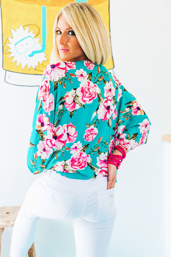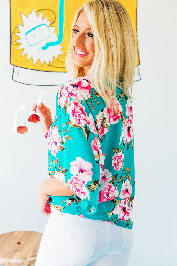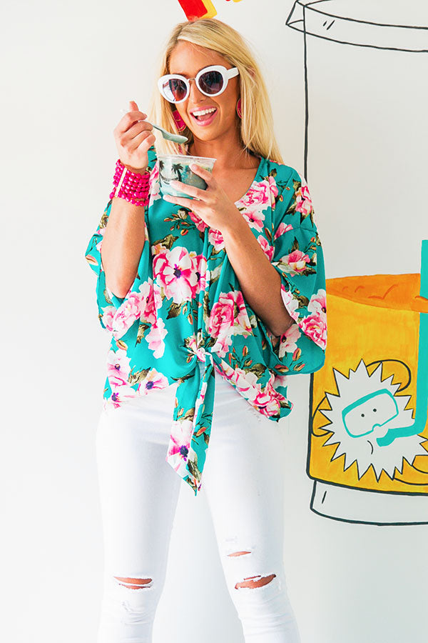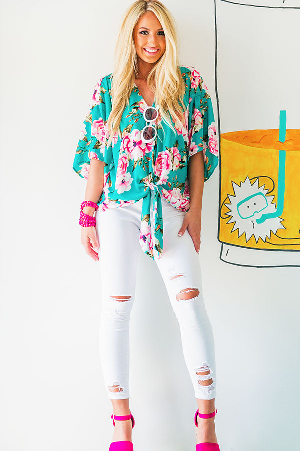 Cover the field with a top so versatile it can be styled to suit any occasion! The "Garden Mingle Floral Shift Top" has a v-cut neckline, short kimono sleeves, a relaxed shift bodice & a trendy tie-front hem. Dress your look up with skinny jeans & a block heel, or down with denim shorts & sandals... You can't go wrong with this fabulous floral tie top!