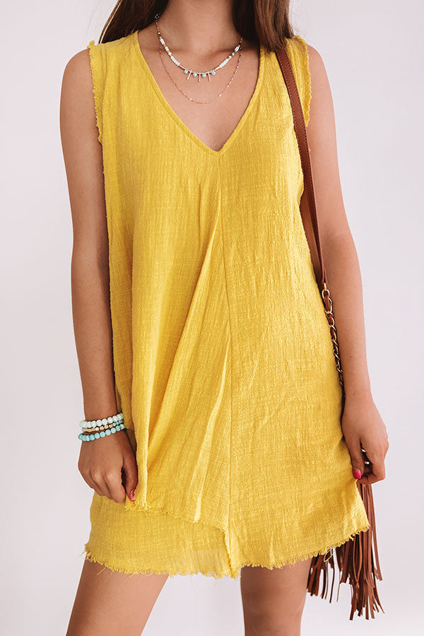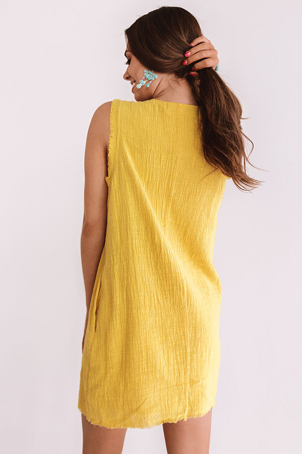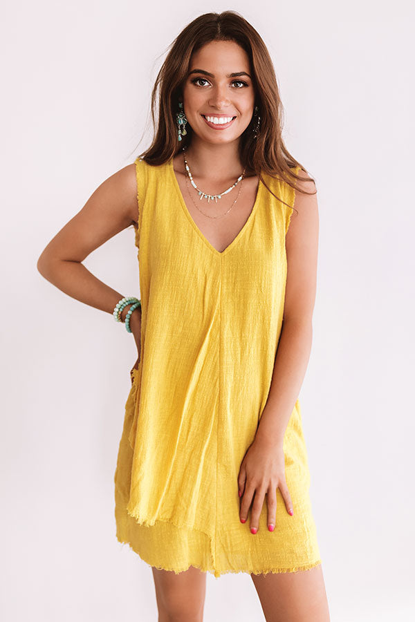 Dress like it's the best day of your life in this chic yellow shift dress adorned with frayed hems, front pockets, v-neck, and a long textured layer! This bright piece pairs wonderfully with simple strapped heels, a long necklace, and a nude handbag for the perfect summer garden party look! Measurements