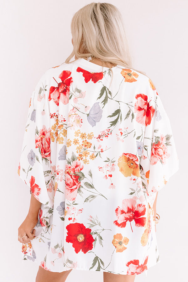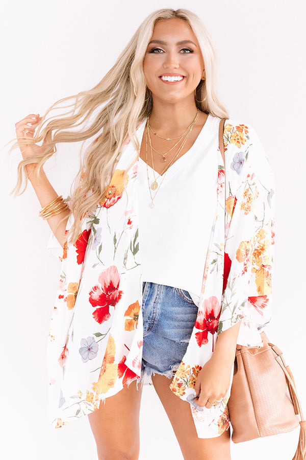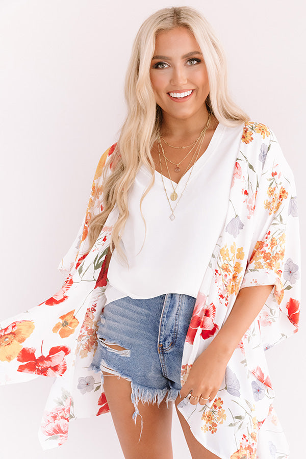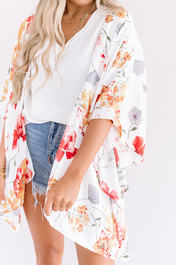 Your style is sure to blossom when you layer up with this adorable "Garden State" overlay featuring ultra lightweight breezy material patterned with a bold and colorful floral print, short oversized bat wing sleeves, and a relaxed open front silhouette that falls into an uneven upper-thigh length hemline with accent side slits! You can pair this versatile piece with just about anything from a basic tank and distressed denim to your fave swimsuit! Measurements