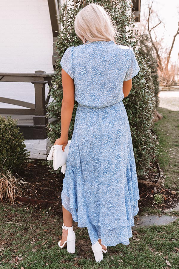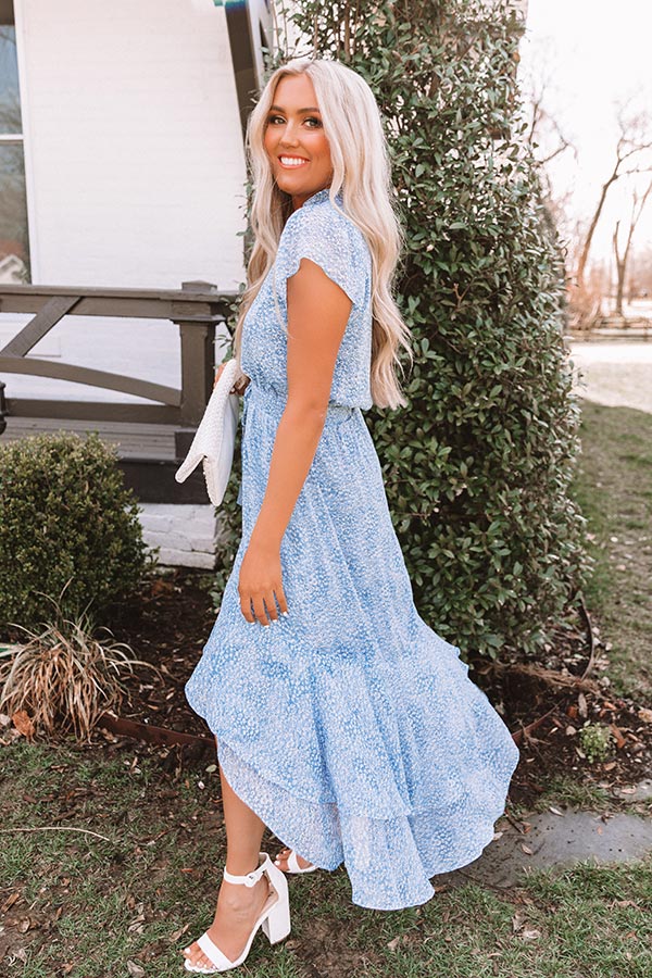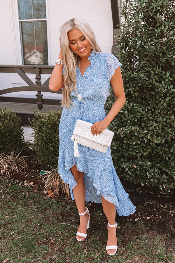 All eyes are sure to be on you when you wear our stunning blue "Gardenia Bliss" maxi featuring lightweight breeze material patterned with a subtle white polka dot pattern, a v-cut neckline with a ruffled collar, short loose sleeves, a wide smocked waistline with a tie belt closure, and an ultra relaxed skirt silhouette that falls into a high/low floor length hemline! We have styled this beauty with a white heel and clutch, but you can also wear it with "The Sydney Wedge in Gold" and our gold "Spread Your Wings Butterfly Hair Clip Set!" Measurements