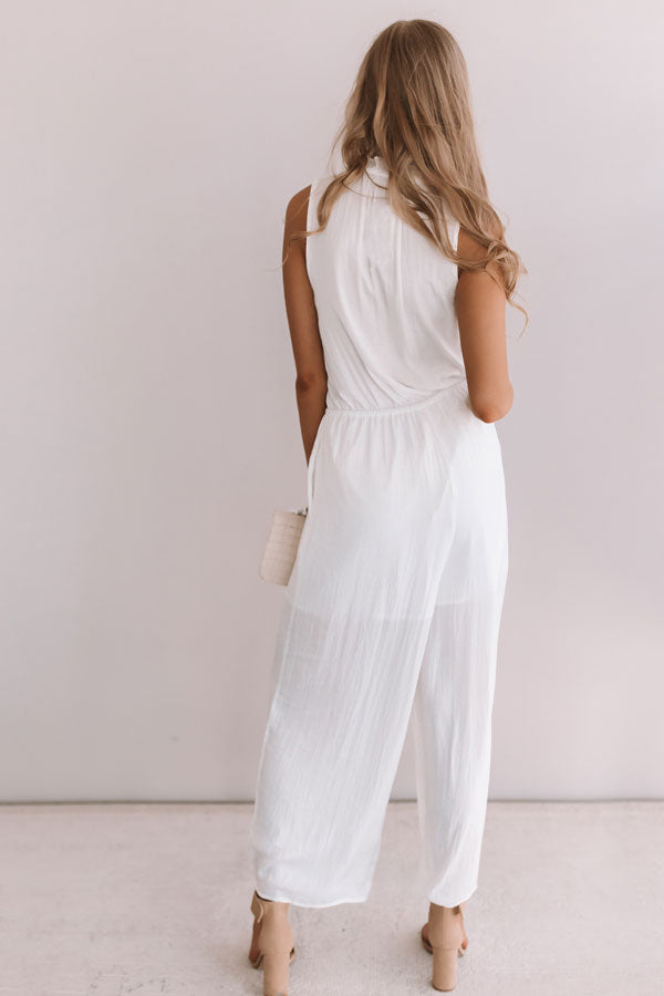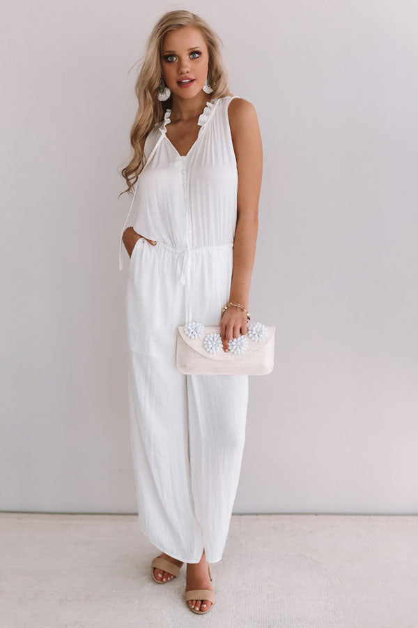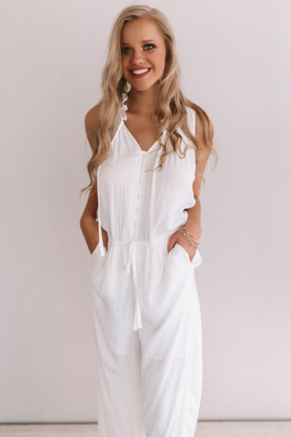 The silky smoothness of this hot white jumpsuit will make you never want to take it off! The breezy pants, cinched waistline with a belt tie, v-neck, ruffled collar with string ties, and row of buttons down the bodice ensure that you are looking your summer best from your head to your toes! This vibrant piece pairs beautifully with nude heels and a matching clutch or it can be styled with snake print accents like our "Elena Snake Print Heel" and "Twist And Shout Snake Print Headband," making this perfect outfit for a summer filled with "gelato and kisses!" Measurements
