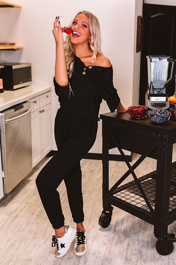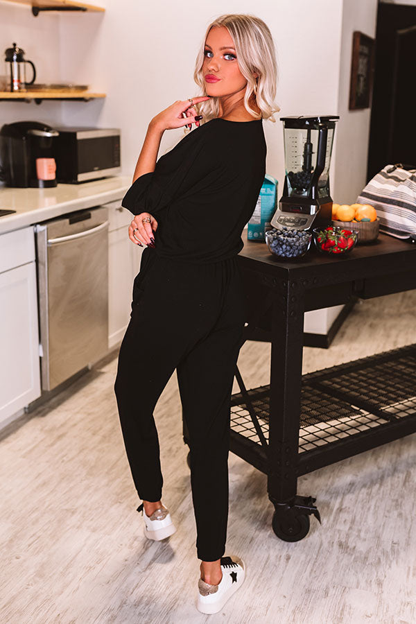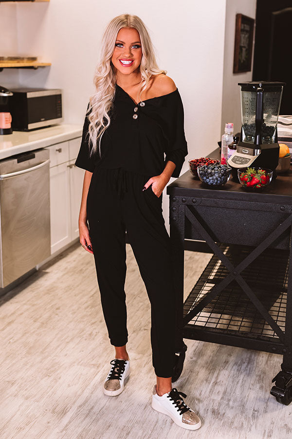 Jump into style with our charming black 'Gentle Reminder Jumpsuit' featuring soft lightweight material, loose half sleeves, a button up bodice with a rounded neckline, a cinched waistline with a tie closure, accent side pockets, and a slouched pants silhouette that tapers into fitted ankle-length hemlines! Measurements