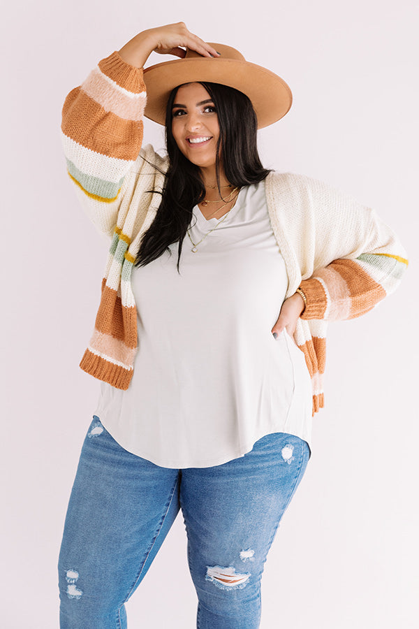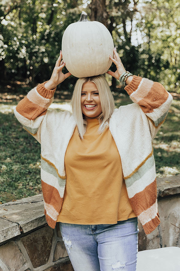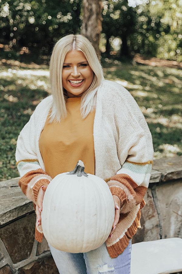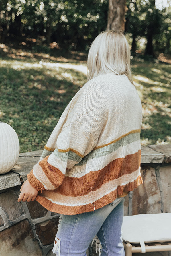 You will feel nothing but genuine warmth when you layer up with this adorable cream colored cardigan featuring soft lightweight tight knit material, horizontal green and orange hued color block stripes, long loose sleeves with fitted cuffs, ribbed trim detailing, and a relaxed open front silhouette that falls into a straight mid-thigh length hemline!
