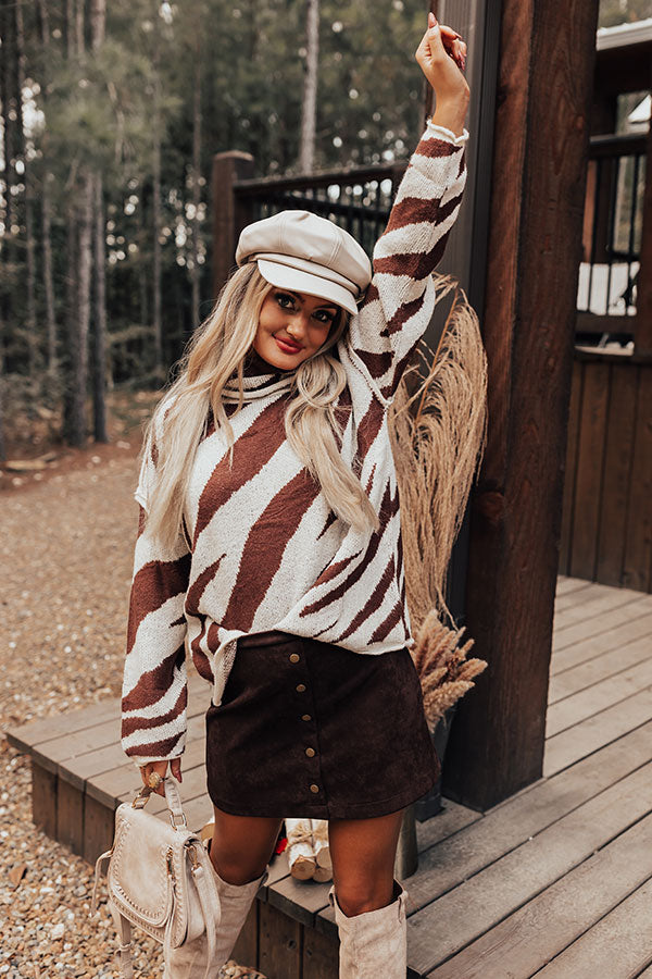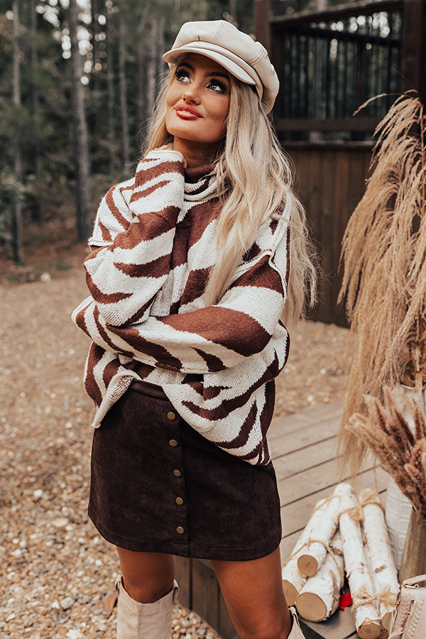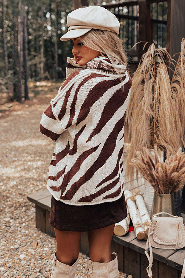 Let your wild side run free in our pretty white 'Get A Clue' sweater featuring soft knit material patterned with a dark brown hued zebra print, a bunched turtle neckline, long loose sleeves, and a slouched silhouette that falls into a straight hemline! Measurements
