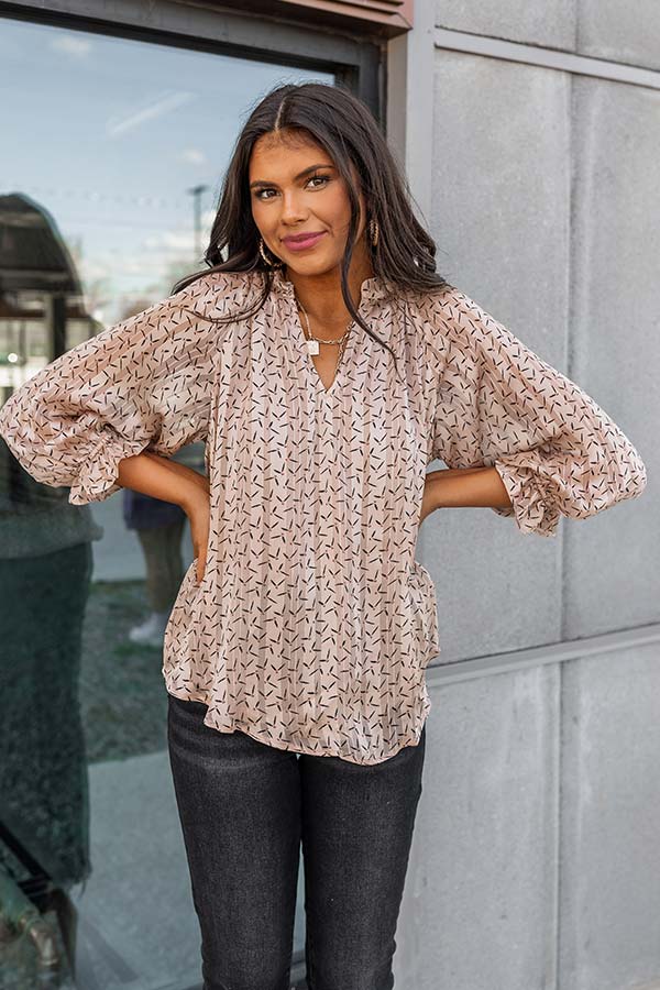 Stay stylish from nine to wine with our adorable neutral "Get To Work Top" featuring lightweight breezy material with an abstract pattern, a v-cut neckline with a short collar, oversized bubble half sleeves with fitted elastic cuffs, and a relaxed silhouette that falls into a rounded hemline! This charming piece pairs perfectly with some dark wash skinnies, brown mule heels, and a gold clutch, but you cal also wear it with our "Office Goals High Waist Trousers in Black," "The Ariella Heel in Natural," and our "Brunch Bound Raffia Headband in Black!"