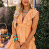 Arrive in style in our charming nectarine colored 'Getting Inspired' dress featuring lightweight material, a deep v-cut neckline with ruffled overlay trim that continues over the shoulders to form flirty cap sleeves, a cinched waistline, a low back with a tie closure, and a tiered babydoll silhouette that falls into a straight mid-thigh length hemline!