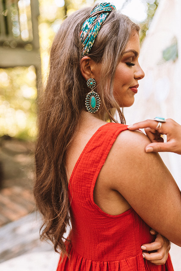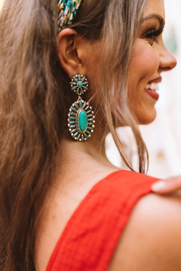 You are sure to "get noticed" when you accessorize with these stunning statement earrings featuring rustic silver flower studs with turquoise stone centers and large dangling turquoise oval stones surrounded by smaller turquoise oval stones all set in rustic silver!
