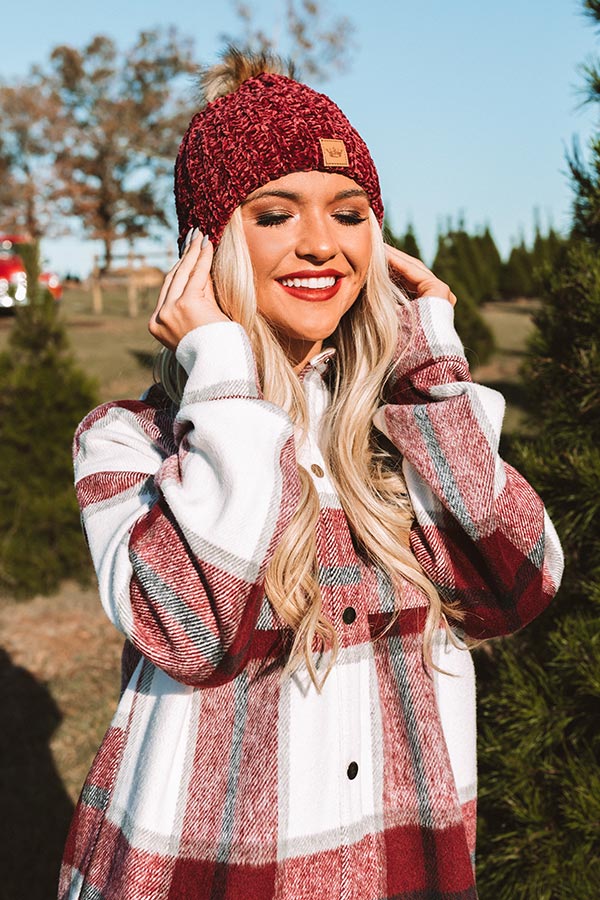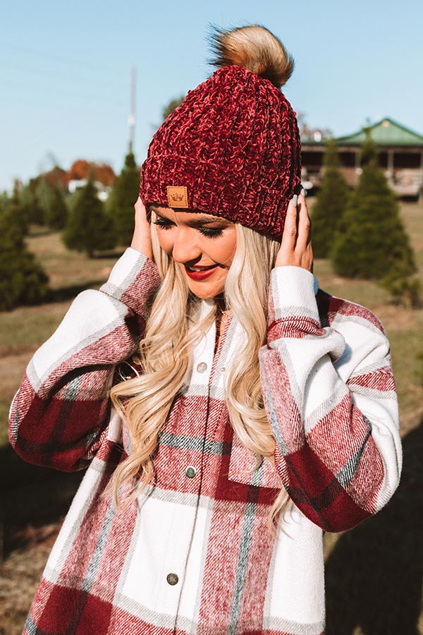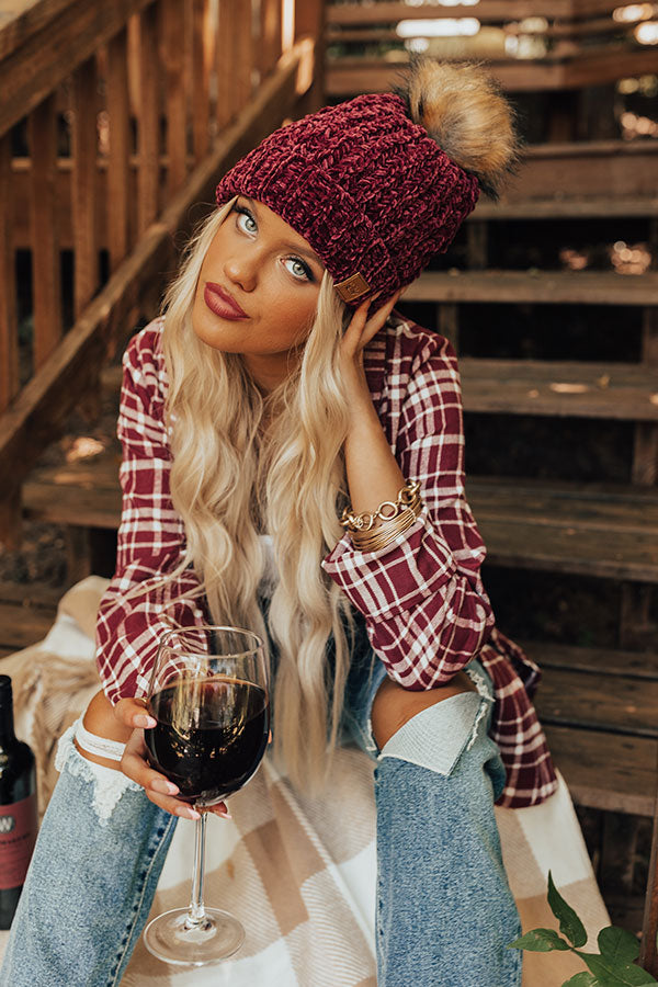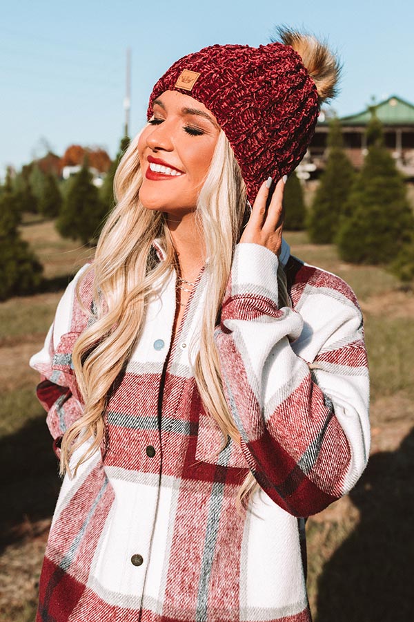 We don't blame you for adding this adorable wine colored beanie to your gift list with its ultra soft loose knit chenille material, rolled silhouette, and accent faux fur pom!