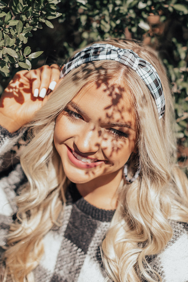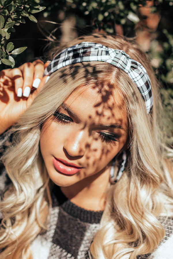 Add a posh finishing touch to any OOTD with our white and black "Girl About Town" headband featuring a bold plaid pattern, an open structured band, and an accent top knot!