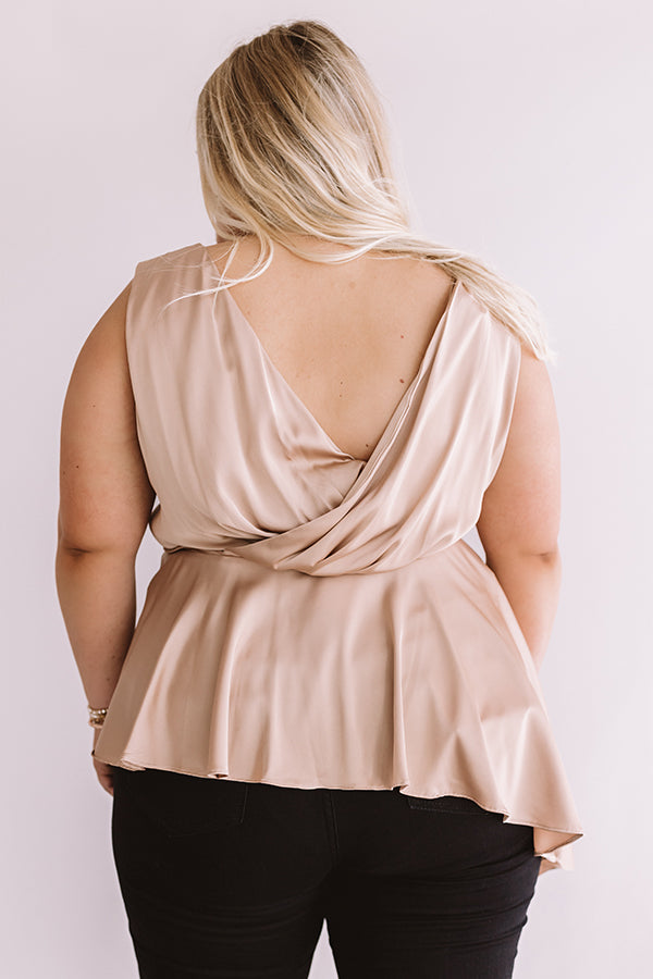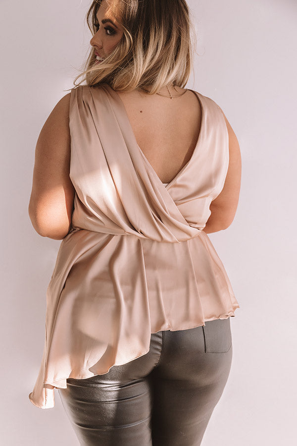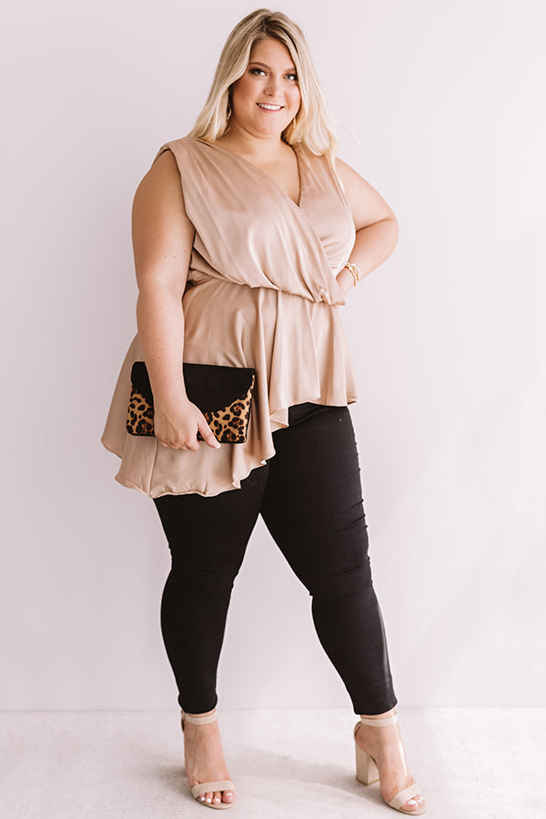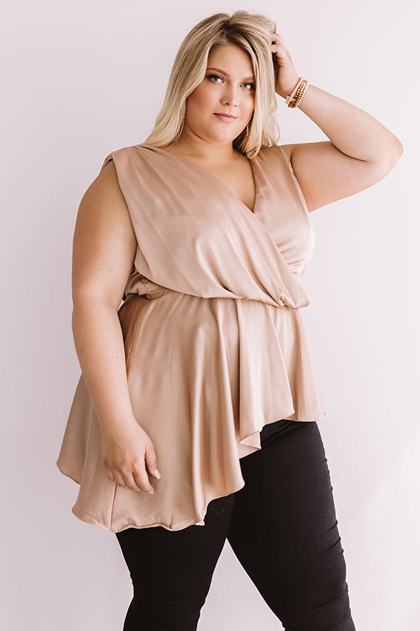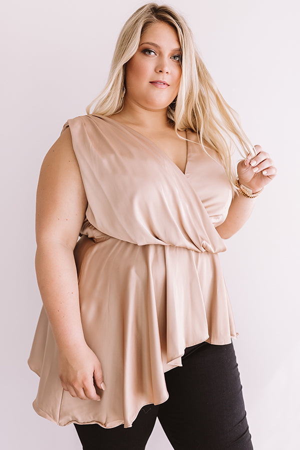 Plus Size - We guarantee that you won't find a better piece to wear for a "girls night out" than this neutral hued top featuring a lightweight satin material, a wrapped bodice with a v-cut neckline and draped low back, wide shoulder straps, a fitted waistband, and an asymmetrical high low peplum hemline! This flirty but elegant piece can be styled a variety of ways, like with some black skinnies, a leopard clutch, and a matching heel, or with some denim flares and wine colored accessories like "The Brinkley Heel" and our ""Say It Ain't Soho Hat!"