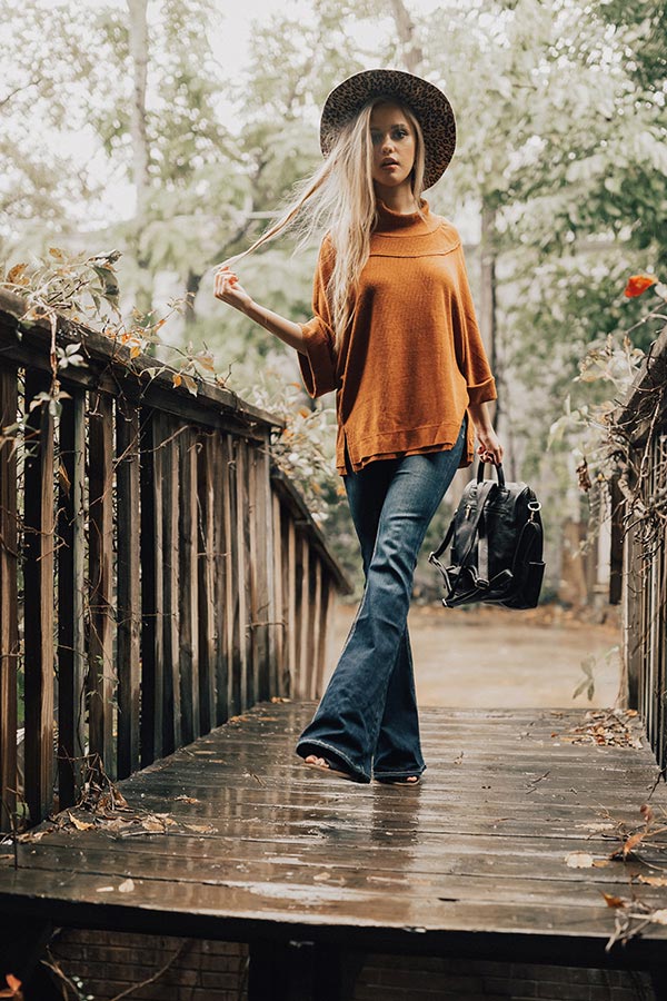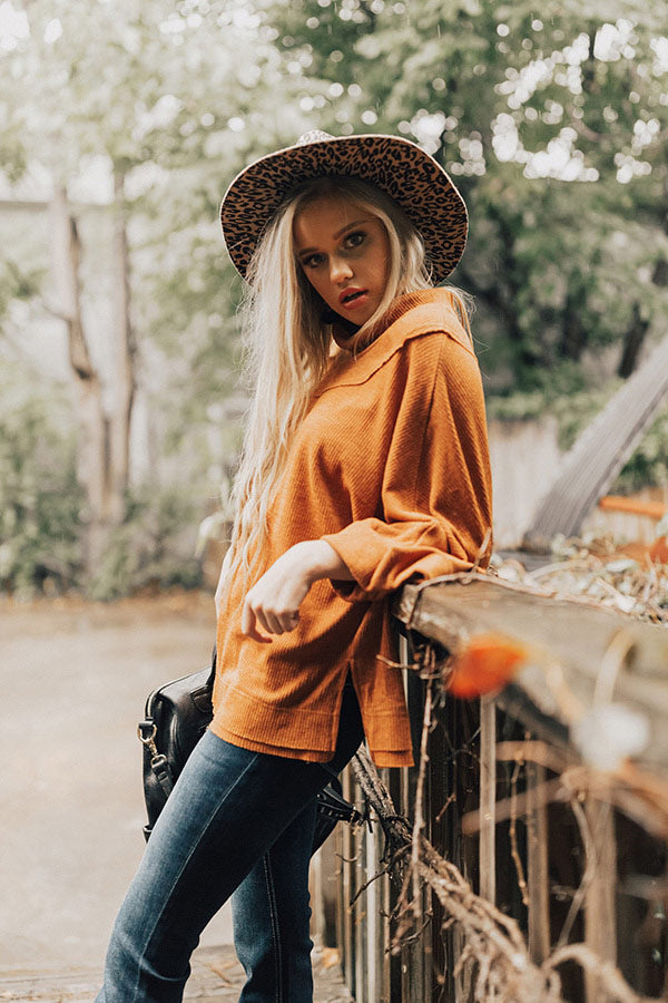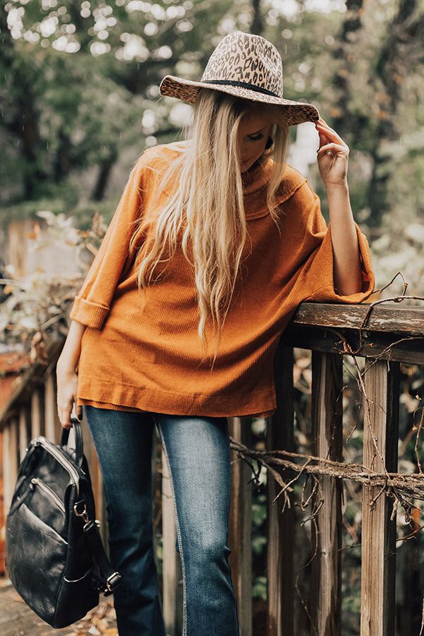 When you're rushing to find an outfit and headed out for a "girls night" throw on this rust colored shift top featuring a high rounded neckline with a turtleneck, a subtle ribbed texture, exposed seams, flared 3/4 length sleeves with rolled cuffs, a relaxed bodice, and a side split hemline with a straight front and rounded back! For a GNO you can style this piece with some denim flares, a black backpack, and a leopard wedge and hat, or you can tuck it into a black skirt and accessorize with grey accents like our "Name Dropper Hat" and "The Jess Faux Leather Heel!" Measurements