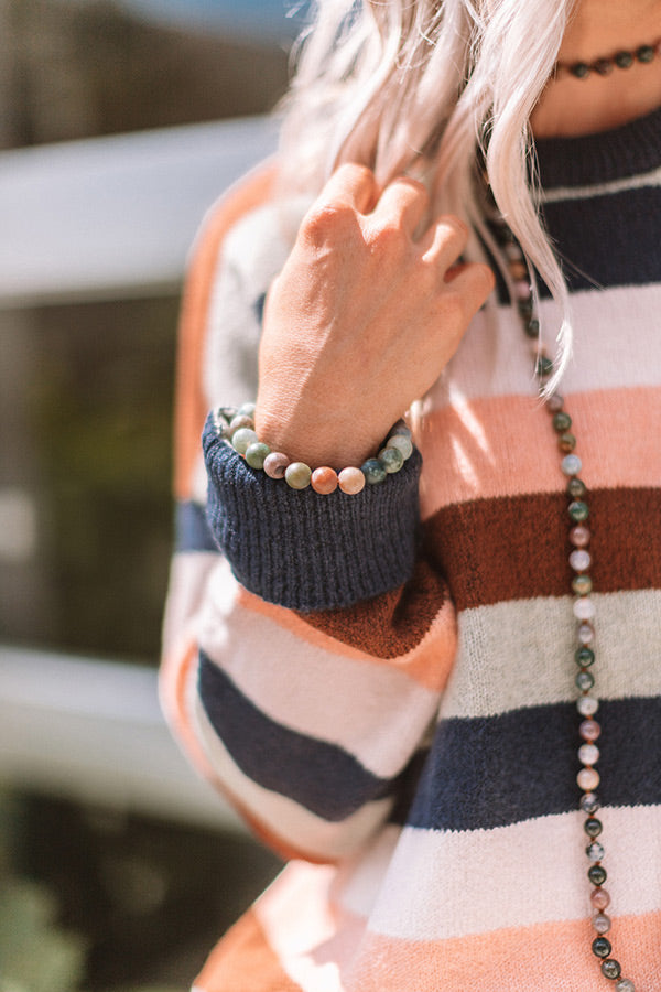 Accessorize your way through the season with the "Girls Of Fall" bracelet featuring marbled earthy toned circle beads!