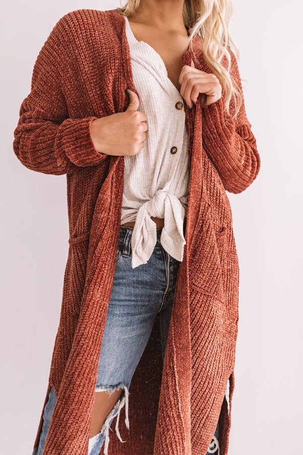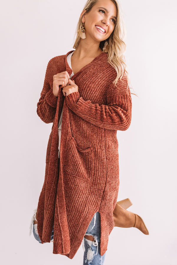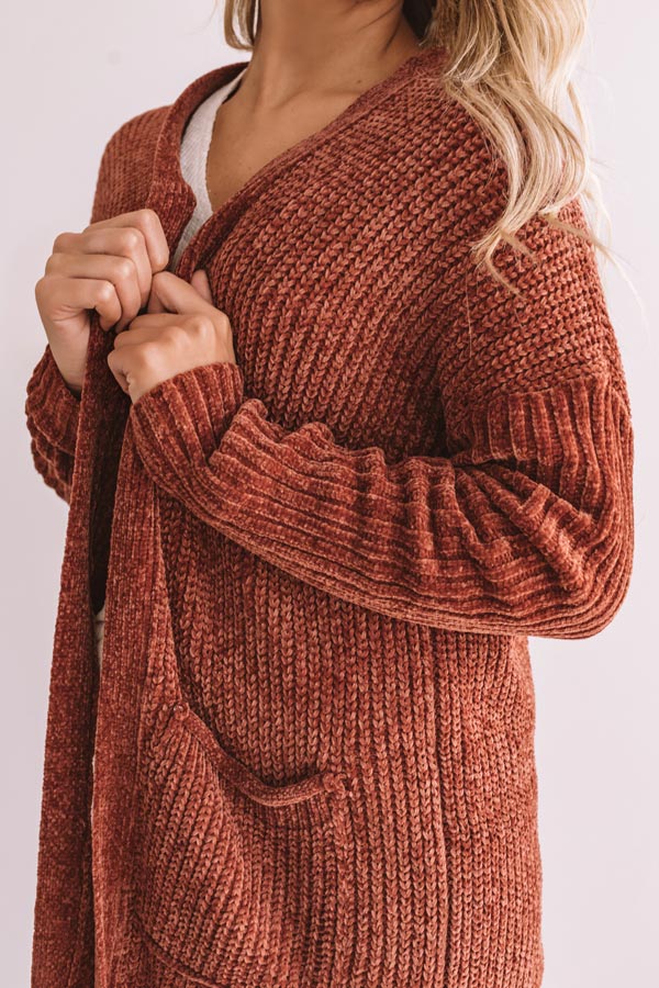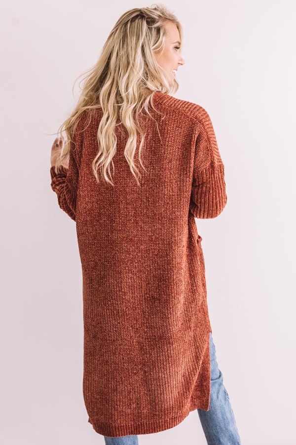 This warm and cozy dark rust colored cardigan is for all the "girls of fall" with its soft loose knit chenille material with subtle ribbed texturing, long semi loose sleeves, two accent pockets, and a relaxed open front silhouette that falls into a straight knee-length hemline with high side slits! You can style this versatile piece with just about anything from a basic tank to a sweater, jeans to dresses, wedges to sandals, clutches to totes, and hats to earrings! Measurements