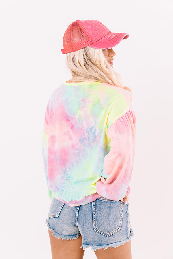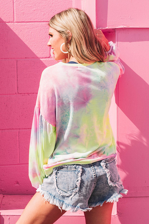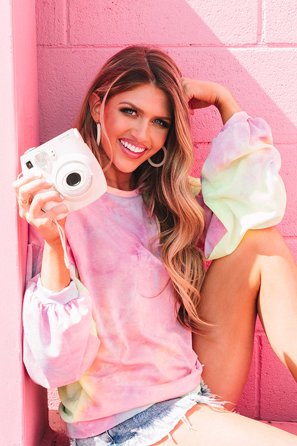 We have no doubt you will want to give this trendy sweatshirt a swirl with its soft lightweight material patterned with violet/pink and blue/green yellow tie dye, a high rounded neckline, long bubble sleeves with fitted cuffs, and a relaxed silhouette that falls into a straight hemline! Measurements