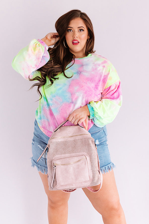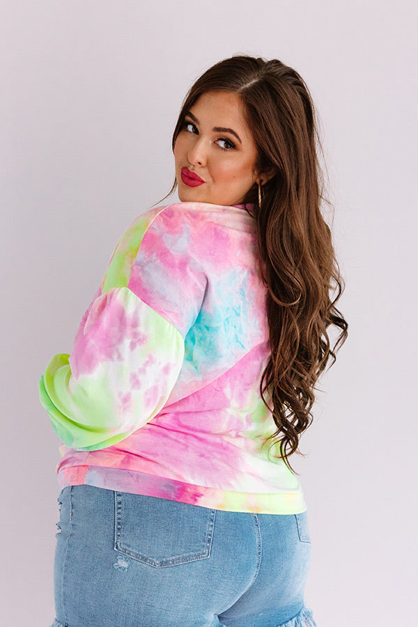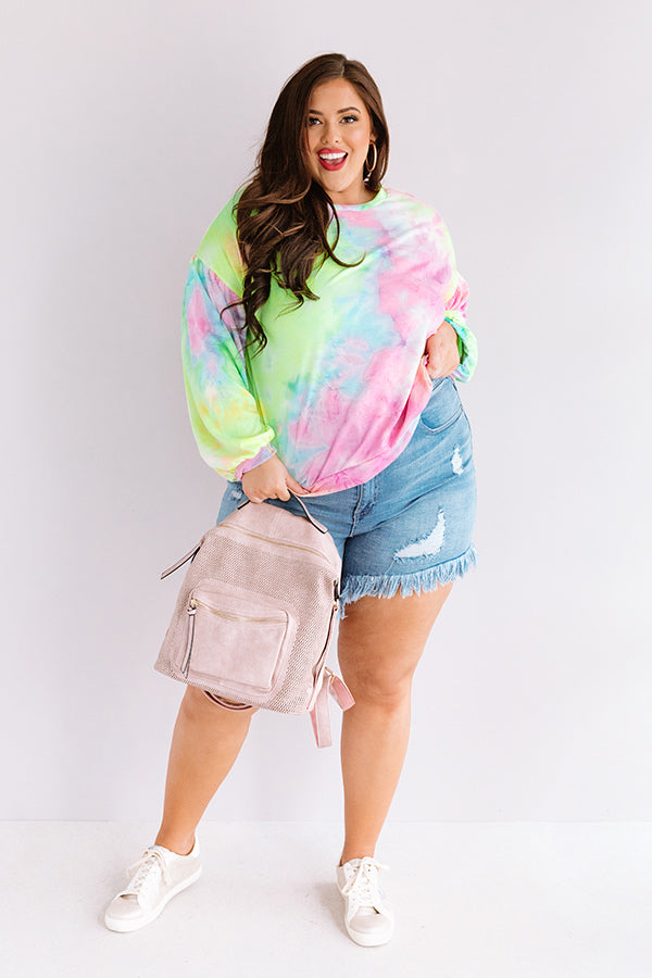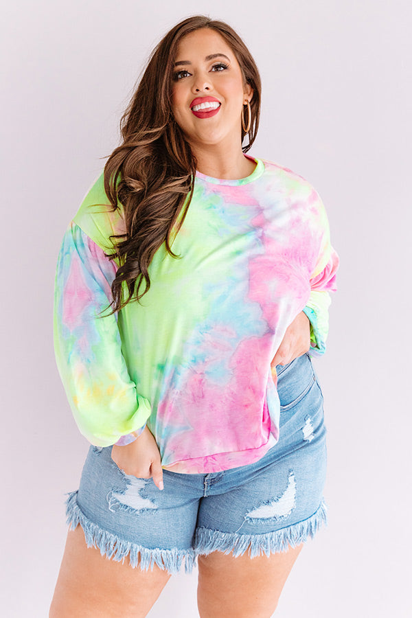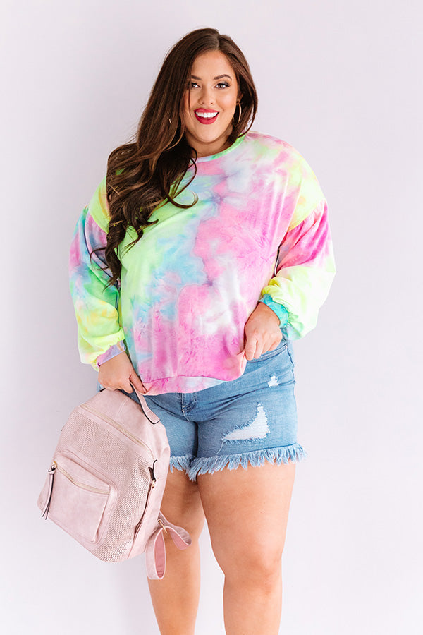 Plus Size - We have no doubt you will want to give this trendy sweatshirt a swirl with its soft lightweight material patterned with violet and blue/green yellow tie dye, a high rounded neckline, long bubble sleeves with fitted cuffs, and a relaxed silhouette that falls into a straight hemline! We have styled this vibrant piece with some distressed denim shorts , a faux suede backpack, and trendy sneakers, but you can also wear it with some frayed white skinnies, "The Avonlea Espadrille in Clear," and our "Relaxing Poolside Sunnies in Clear!" Measurements