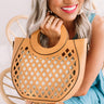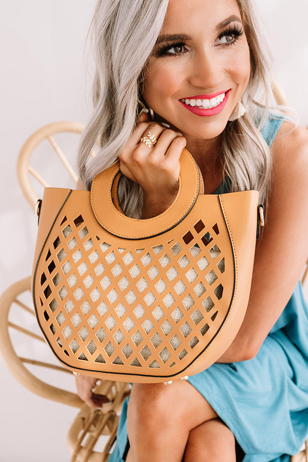 You are sure to set high "glam expectations" when you accessorize with this adorable camel colored tote featuring sleek faux leather material with diamond cutout detailing, two circle handles with a snap closure, a removable shoulder strap, and a woven inner pouch!