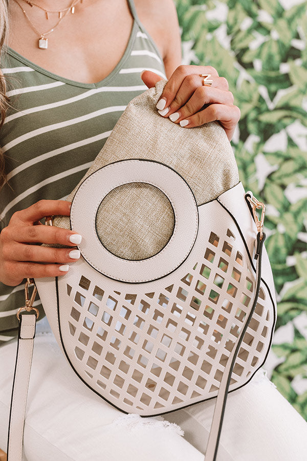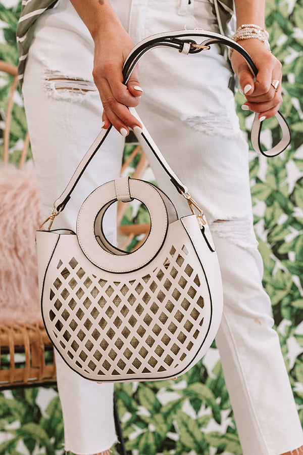 You are sure to set high "glam expectations" when you accessorize with this adorable ivory colored tote featuring sleek faux leather material with diamond cutout detailing, two circle handles with a snap closure, a removable shoulder strap, and a woven inner pouch!