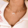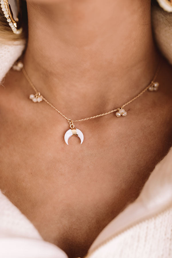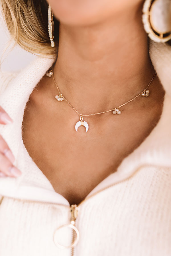 Everyone is sure to see you as a "glamour girl" when you wear this simple but significant necklace featuring a short dainty gold chain, mini beaded clusters, and ivory crescent moon charm!