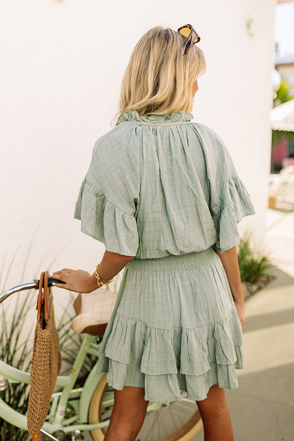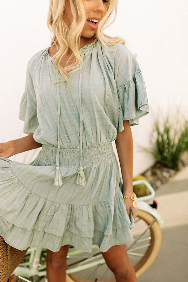 Compliments are sure to fly your way when you wear our chic pear colored 'Glass Of Pinot Dress' featuring lightweight material, a v-cut neckline with a tassel tie closure and ruffled trim detailing, lose half sleeves with subtle flared cuffs, a fitted smocked waistline, and a relaxed tiered skirt silhouette that falls into a straight mid-thigh length hemline!