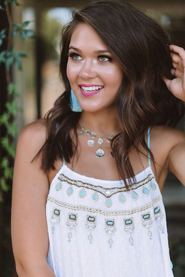 People will get a glimpse of gorgeous when they see you in this white dress with its embellished detailing, blue accents, and twisted rope spaghetti straps! This elegant piece pairs remarkably with neutral platform heels, a blue faux suede hat, and tassel earrings for a delicate summer style! Measurements