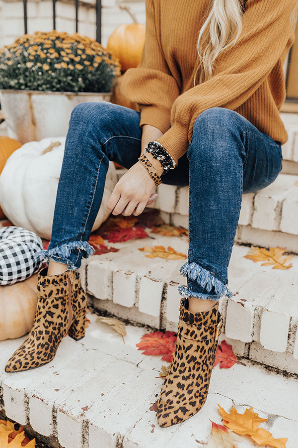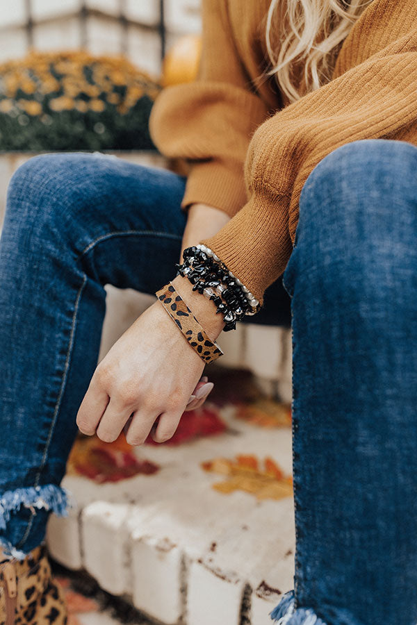 There is no better way to achieve "glitz on the go" than with this five piece bracelet set featuring four black and neutral beaded elastic bands and a leopard print snap closure band!