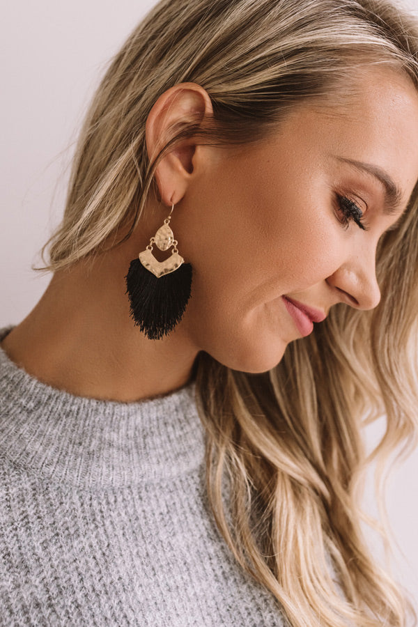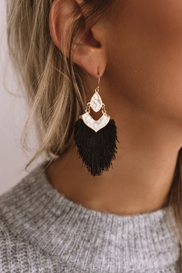 We guarantee you will look "glitzy and pretty" when you accessorize with these statement earrings featuring textured gold circle charms and pointed bars with black string tassels!