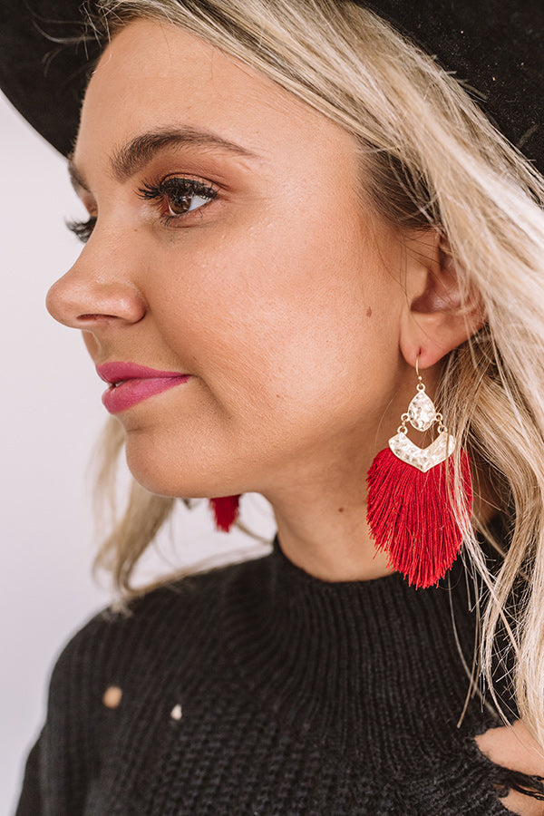 We guarantee you will look "glitzy and pretty" when you accessorize with these statement earrings featuring textured gold circle charms and pointed bars with wine colored string tassels!