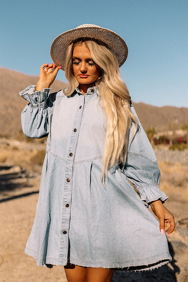 People are sure to envy you when you wear our darling 'Glorious Afternoon' dress featuring lightweight light wash chambray material with accent fading across the bodice, a button down front with a collared neckline, 3/4-length puff sleeves with flared cuffs, hidden side pockets, and a relaxed silhouette that falls into a raw-cut mid-thigh length hemline!