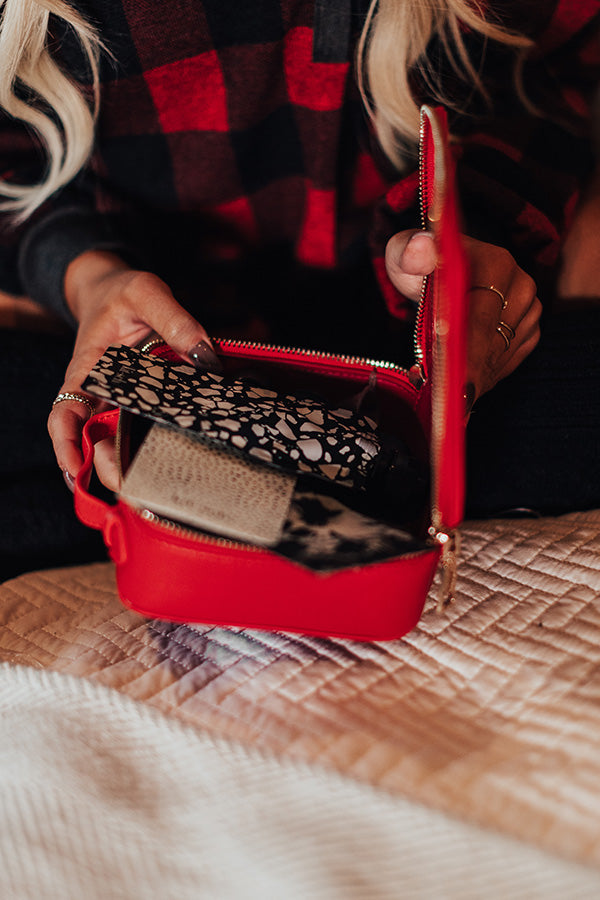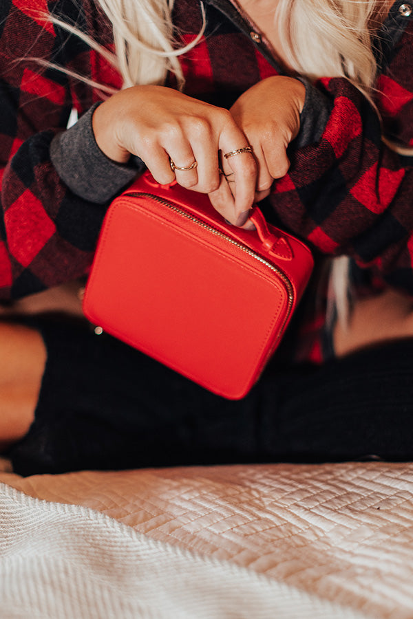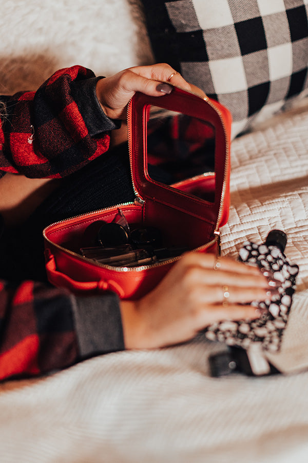 Travel in style with our adorable red "Glowing Review Cosmetic Bag" featuring sleek lightweight material, a single handle, and a spacious rectangular pouch with a zip closure!