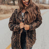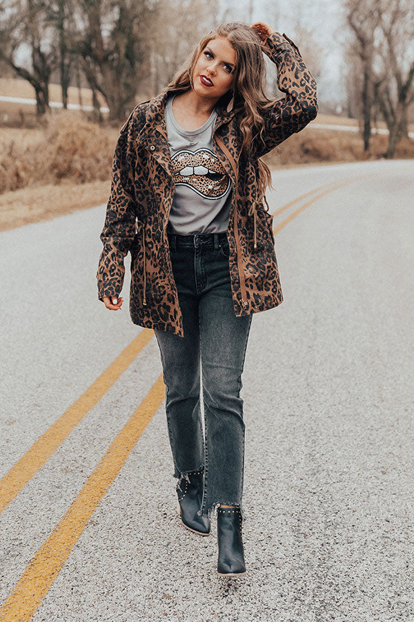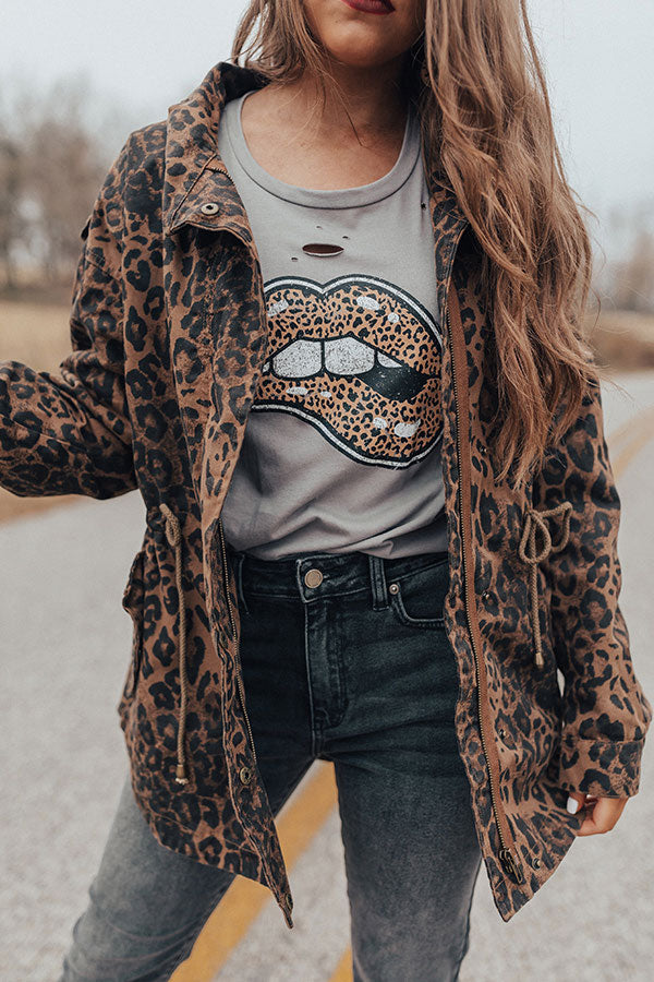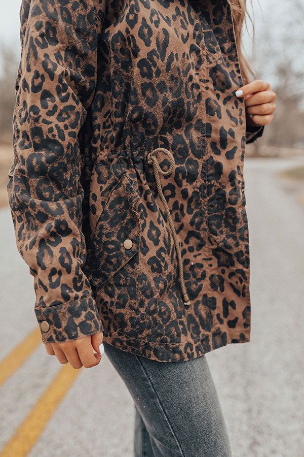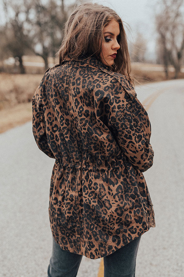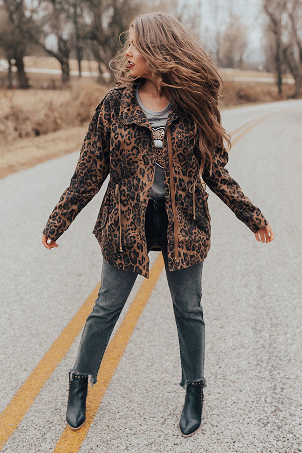 You will be "going all out" when you wear this adorable cargo jacket featuring lightweight material patterned with a bold black and brown leopard print, long loose sleeves with fitted button closure cuffs, a collared neckline, a cinched tie string waistband, two accent flap pockets, and a relaxed zip and snap up silhouette that falls into a rounded tunic length hemline! You can style this versatile piece with just about anything from a basic tank to a sweater, jeans to skirts or dresses, booties to wedges or sandals, clutches to totes, and hats to earrings! Measurements