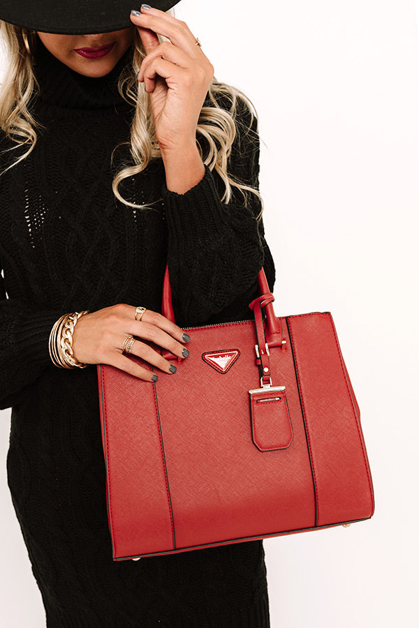 As if you needed another reason to go glam, this red hot tote is the perfect piece to accessorize with! It features a sleek faux leather material, two handles with an accent key charm, two zip up pouches with a snap button closure in between, a fully lined middle pouch with additional pockets, and a removable and adjustable crossbody handle!