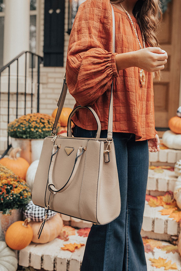 As if you needed another reason to go glam, this taupe colored tote is the perfect piece to accessorize with! It features a sleek faux leather material, two handles with an accent key charm, two zip up pouches with a snap button closure in between, a fully lined middle pouch with additional pockets, and a removable and adjustable crossbody handle!