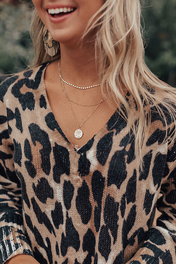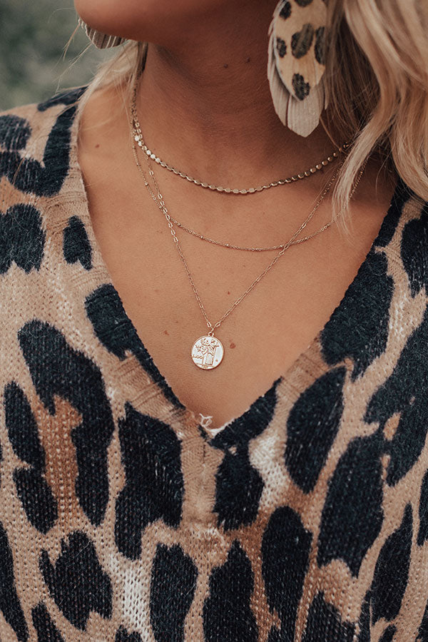 This dainty piece is sure to set the "gold standard" for layered necklaces with its three chains and circle coin pendant!