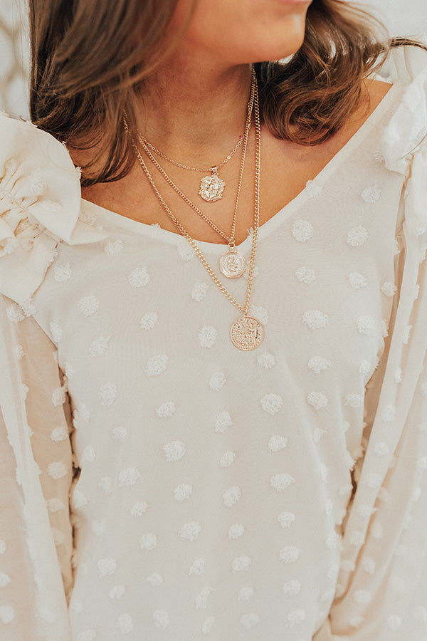 You will look straight out of the "golden age" when you accessorize with this layered necklace featuring three dainty gold link chains with large stamped circle charms!