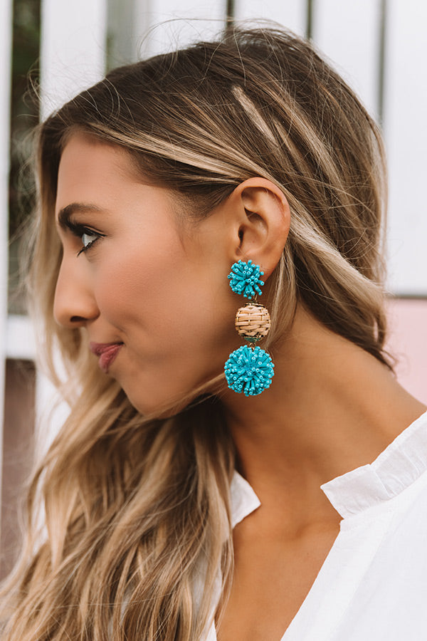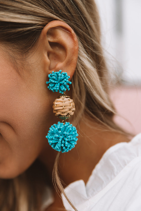 Use the beach as your personal runway in our adorable "Golden Coast" statement earrings featuring dangling tiered turquoise spiked pom poms and wooden textured balls!