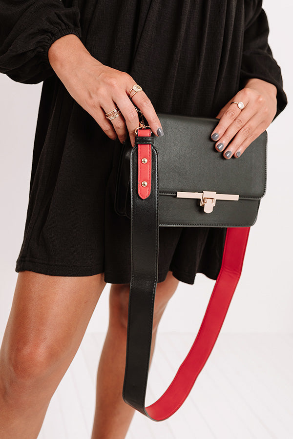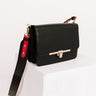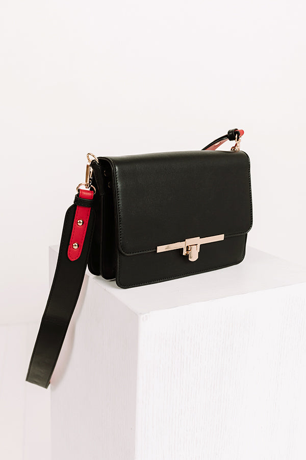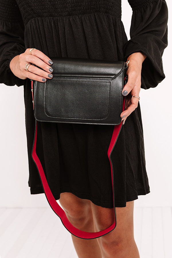 Make a statement with our stylish 'Golden Era' crossbody featuring sleek lightweight faux leather material with red accents, a flap closure with a gold snap, an extra outside pocket, a wide removable shoulder strap, and a spacious fully lined rectangular pouch with additional inside pockets!